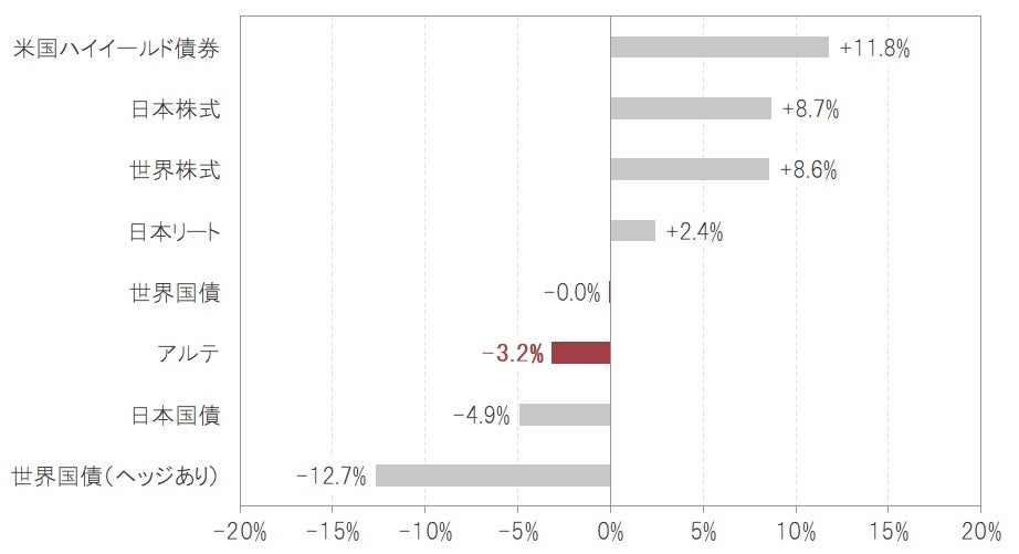 ※日本国債:FTSE日本国債指数、世界国債(ヘッジあり):FTSE世界国債指数(円ヘッジ)、世界国債(ヘッジなし):FTSE世界国債指数(円換算)、米国ハイイールド債券:ICE BofA米国ハイイールド債券指数(円換算)、世界株式:MSCI全世界株価指数(円換算)、日本株式:TOPIX、日本リート:東証REIT指数