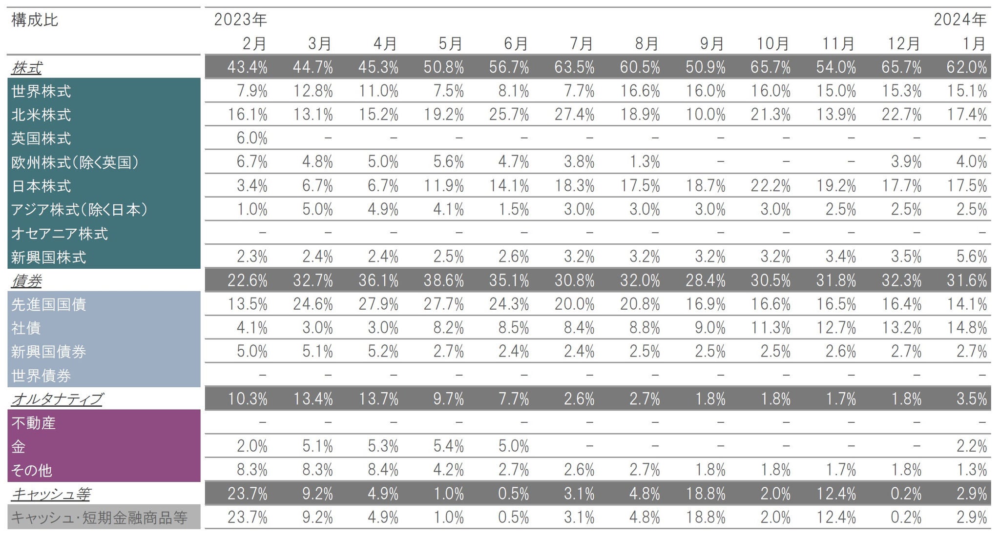 なお、2024年1月末時点の組入比率は、株式が62.0%、債券が31.6%、オルタナティブが3.5%、キャッシュ等が2.9%などとなっています(図表2)。