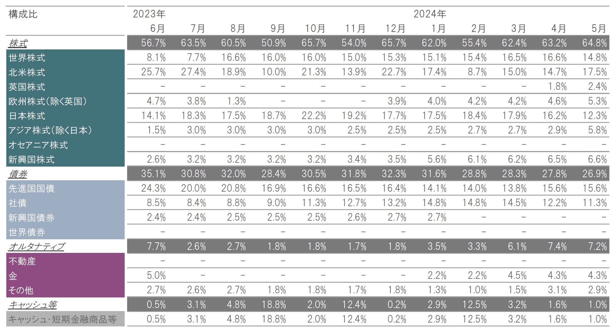 なお、2024年5月末時点の組入比率は、株式が64.8%、債券が26.9%、オルタナティブが7.2%、キャッシュ等が1.0%などとなっています(図表2)。