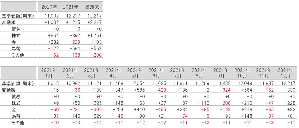 2021年12月は、株式、金、為替がともにプラス寄与となりました。また、2021年年間で基準価額は、金がマイナス寄与となりましたが、株式と為替のプラス寄与が大きく+1,215円となりました。
