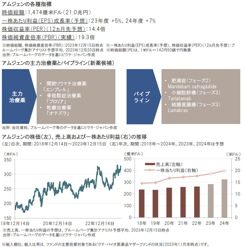 ■アムジェン(米国、組入比率 8.4%(組入1位)):肥満治療薬やがん治療薬のパイプライン(新薬候補)が注目、関節リウマチ、骨粗しょう症などの治療薬が主力