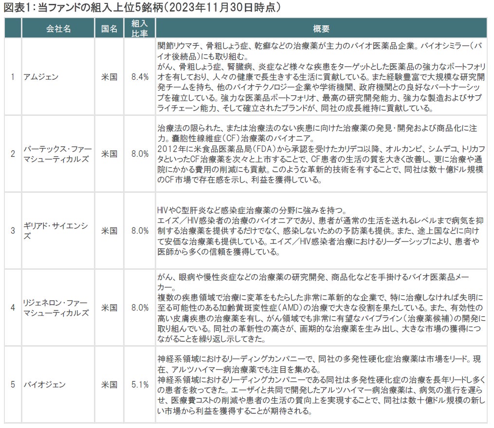 当ファンドはバイオ医薬品企業に投資しています。本レポートでは、2023年11月末時点で組入上位を占める主要なバイオ医薬品企業の状況について紹介します。