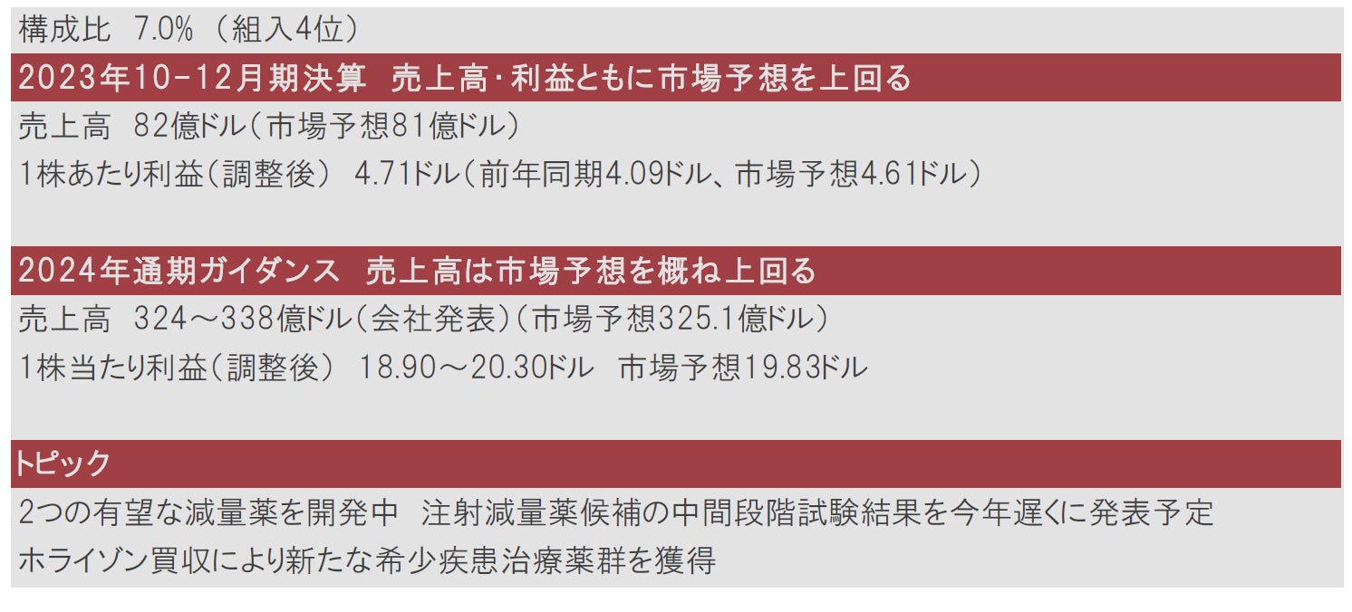 現在、開発中の肥満治療薬が注目されます。また、ホライゾン・セラピューティクスの買収により希少疾患領域を強化したことの業績への寄与が期待されています。