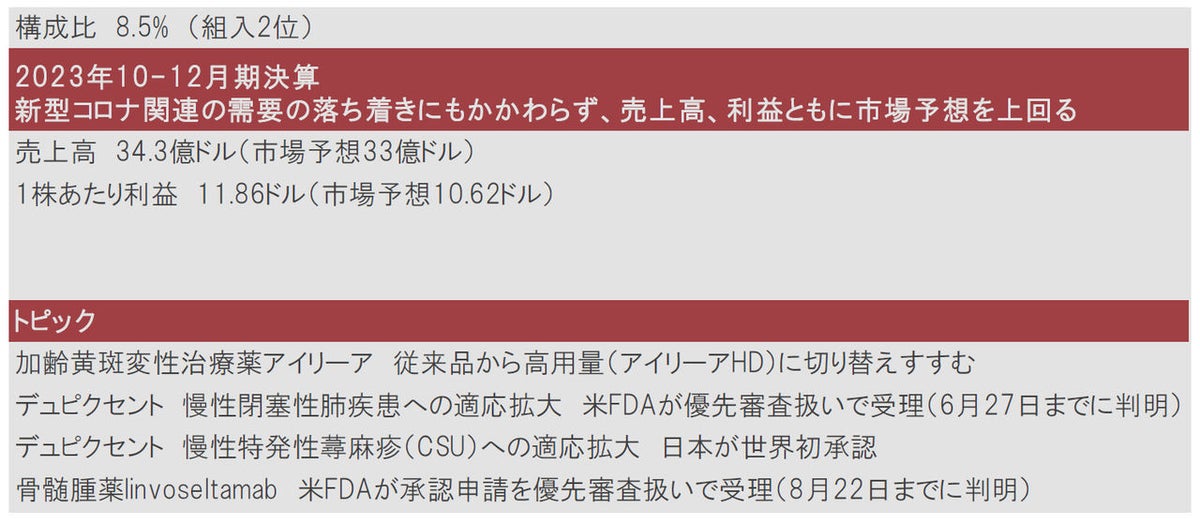 主力の加齢黄斑変性治療薬アイリーアは従来品から高用量(アイリーアHD)への切り替えが進むほか、デュピクセントの適応拡大が期待されています。