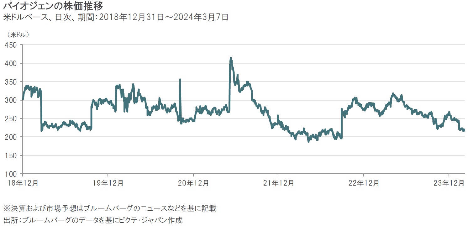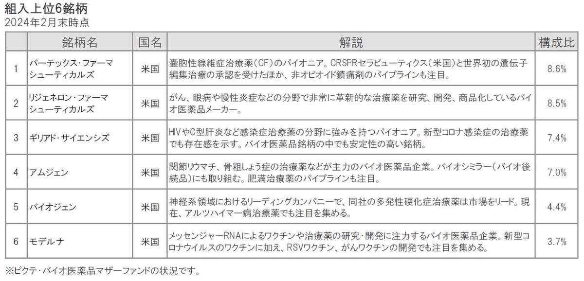 当ファンドの組入上位の銘柄では、バーテックス・ファーマシューティカルズ(米国)、リジェネロン・ファーマシューティカルズ(米国)、アムジェン(米国)、モデルナ(米国)が売上高、利益とも市場予想を上回る決算を発表した一方、バイオジェン(米国)は売上高・利益ともに市場予想を下回る結果となりました。また、ギリアド・サイエンシズ(米国)は売上高は市場予想を上回ったものの、利益は市場予想を下回りました。