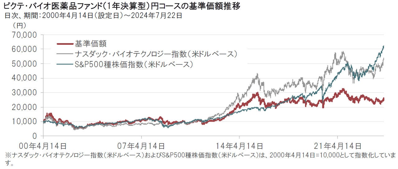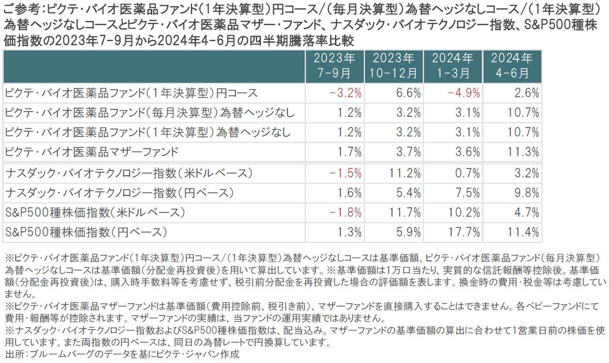 ピクテ・バイオ医薬品マザーファンドは、バイオ医薬品株式の上昇と円安・米ドル高などが寄与し2024年4-6月に11.3%上昇しました。なお、バイオ医薬品株式の代表的な指数であるナスダック・バイオテクノロジー指数(円ベース)の同+9.8%を上回りました(図表1参照)。