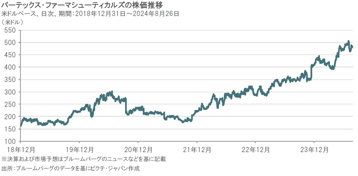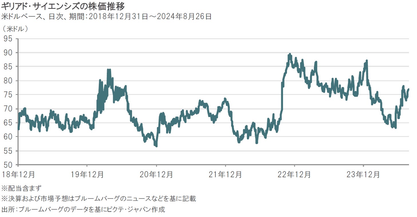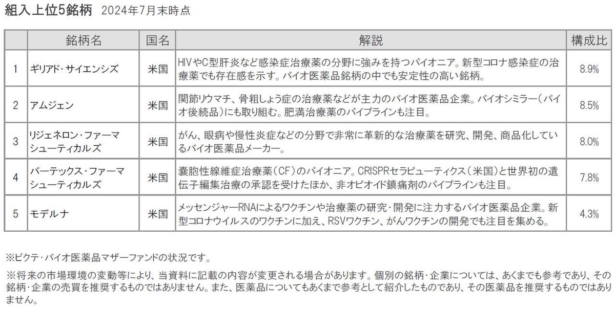 当ファンドの組入上位の銘柄では、ギリアド・サイエンシズ(米国)、リジェネロン・ファーマシューティカルズ(米国)が、主力治療薬の販売が好調だったことから売上高、利益ともに市場予想を上回る決算となりました。またアムジェン(米国)は企業買収による費用の増加、モデルナ(米国)は治験などの費用の増加などが影響し利益は市場予想を下回りましたが、売上高は市場予想を上回りました(モデルナは赤字)。一方、バーテックス・ファーマシューティカルズ(米国)は、売上高が小幅に市場予想を下回りましたが、2024年通期の売上高見通しは引き上げました。