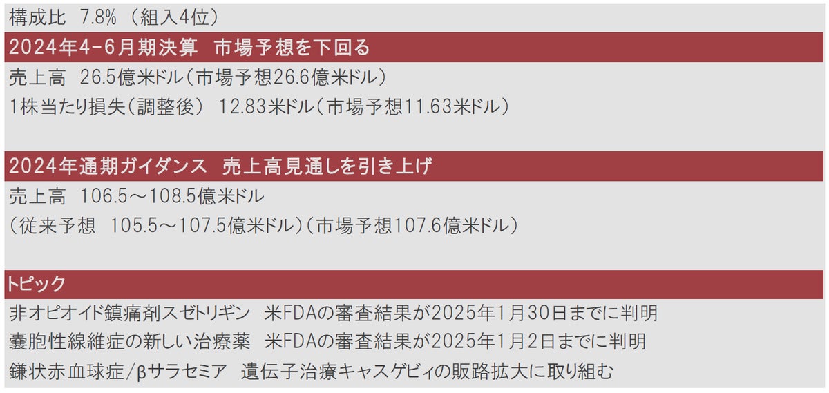 2024年4-6月期の決算は、主力の嚢胞性線維症治療薬トリカフタ/カフトリオが好調でしたが、売上高は小幅に市場予想を下回りました。また、既存治療薬の販売促進および開発中のパイプラインへの投資による費用増に加え、アルパイン・イミューン・サイエンシズの買収による費用などが影響し、利益は赤字となりました。一方、通期の売上高見通しについては、引き上げました。