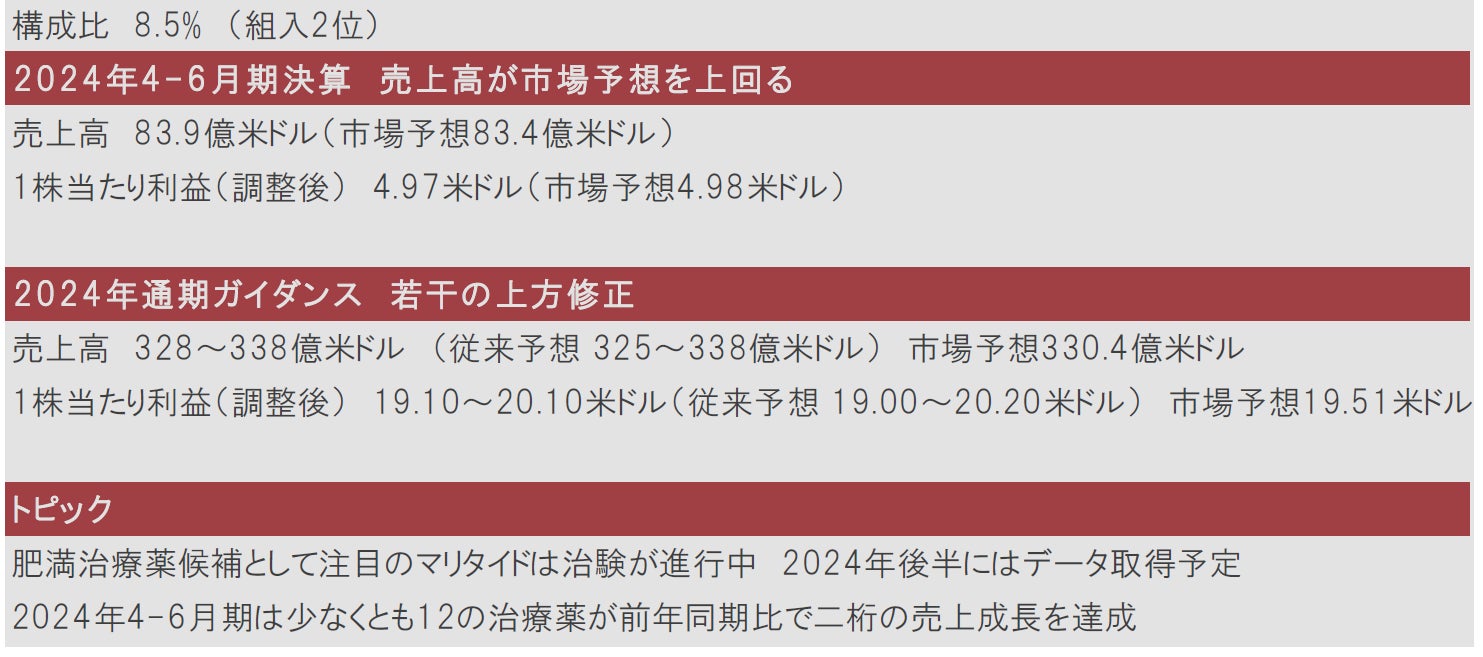 2024年4-6月期の決算は売上高が市場予想を上回った一方、1株当たり利益は市場予想を下回りました。ホライゾン・セラピューティクス買収が、収益力強化につながった一方で、買収に絡む費用の増加が利益を押し下げました。また少なくとも12の治療薬が前年同期比で二桁の売上成長を達成しました。
