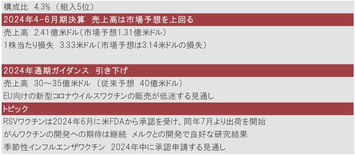 2024年4-6月期の決算は売上高が市場予想を上回った一方、1株当たり損失については市場予想よりも悪い数値となりました。なお2024年通期ガイダンスについては、欧州連合(EU)における新型コロナウイルスワクチンの販売が低迷するとの見通しなどを受けて、売上高の予想を引き下げました。