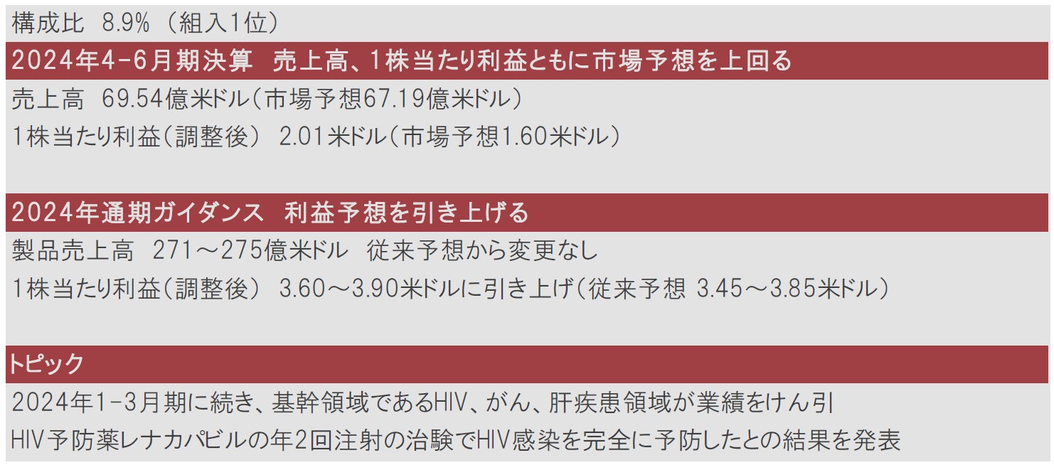 同社の基幹領域であるHIV治療薬のビクタルビの売上が前年同月比+8%と伸びた他、がん領域のイエスカルタ、テカルタス(ともに細胞療法)、肝疾患領域の治療薬群などが堅調で業績をけん引しました。またHIV関連では、予防薬レナカパビルの年2回注射の治験でHIV感染を完全に予防したとの治験結果を発表しました。