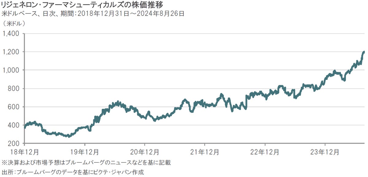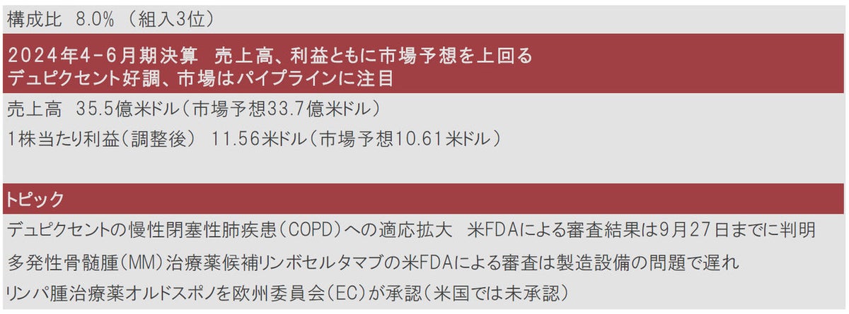 2024年4-6月期の決算は、売上高、利益ともに市場予想を上回りました。ぜんそく、アトピー性皮膚炎などの治療薬デュピクセント(サノフィ(仏)との共同開発)と加齢黄斑変性症治療薬アイリーア(高用量)が業績をけん引しました。