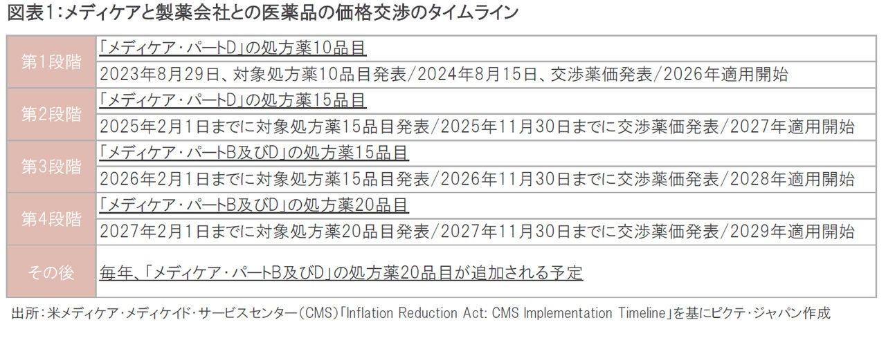 2022年に成立したインフレ抑制法により、これまで禁止されていたメディケアによる製薬会社との医薬品の価格交渉が認められるようになり、薬価交渉が段階的に進められるようにタイムラインが設定されています(図表1参照)。