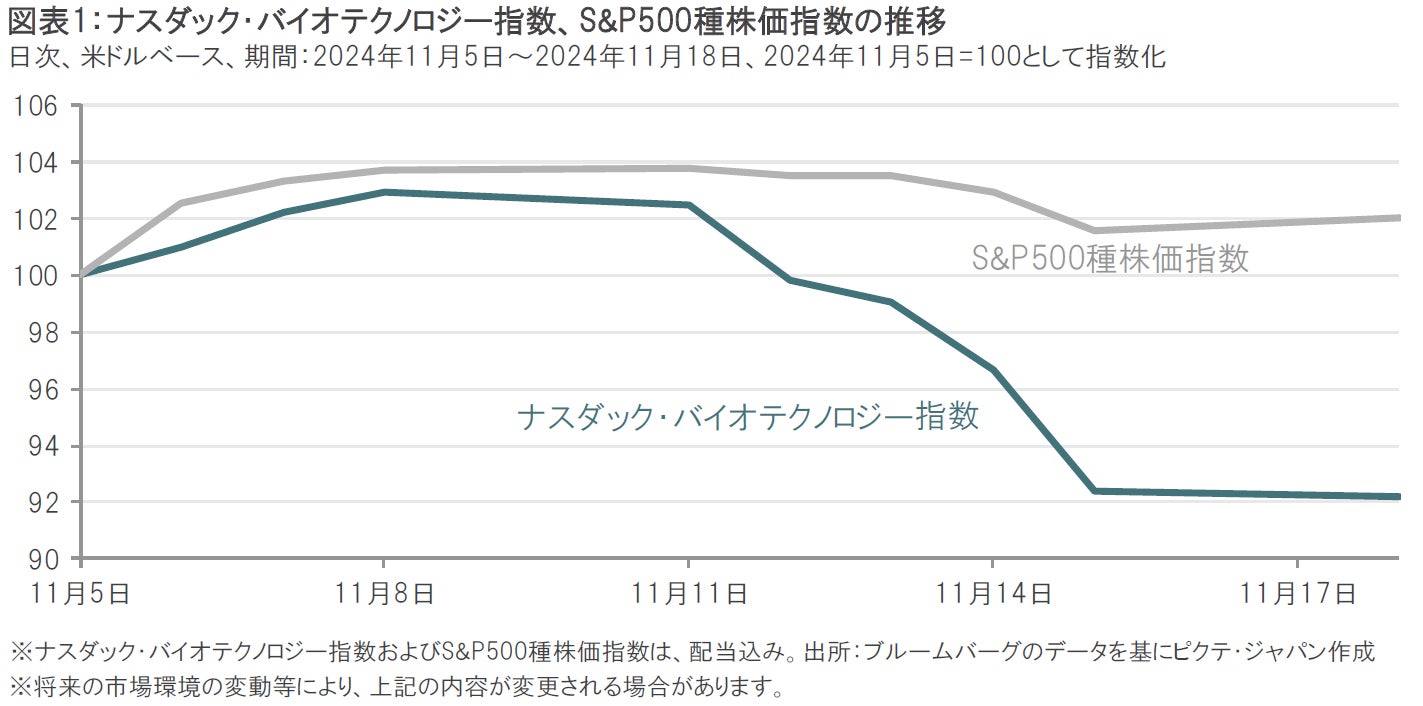 ●米国大統領選挙でトランプ氏が勝利後、インフレ懸念やロバート・ケネディ・ジュニア氏の保健福祉省長官指名が影響し、バイオ医薬品株式は下落
