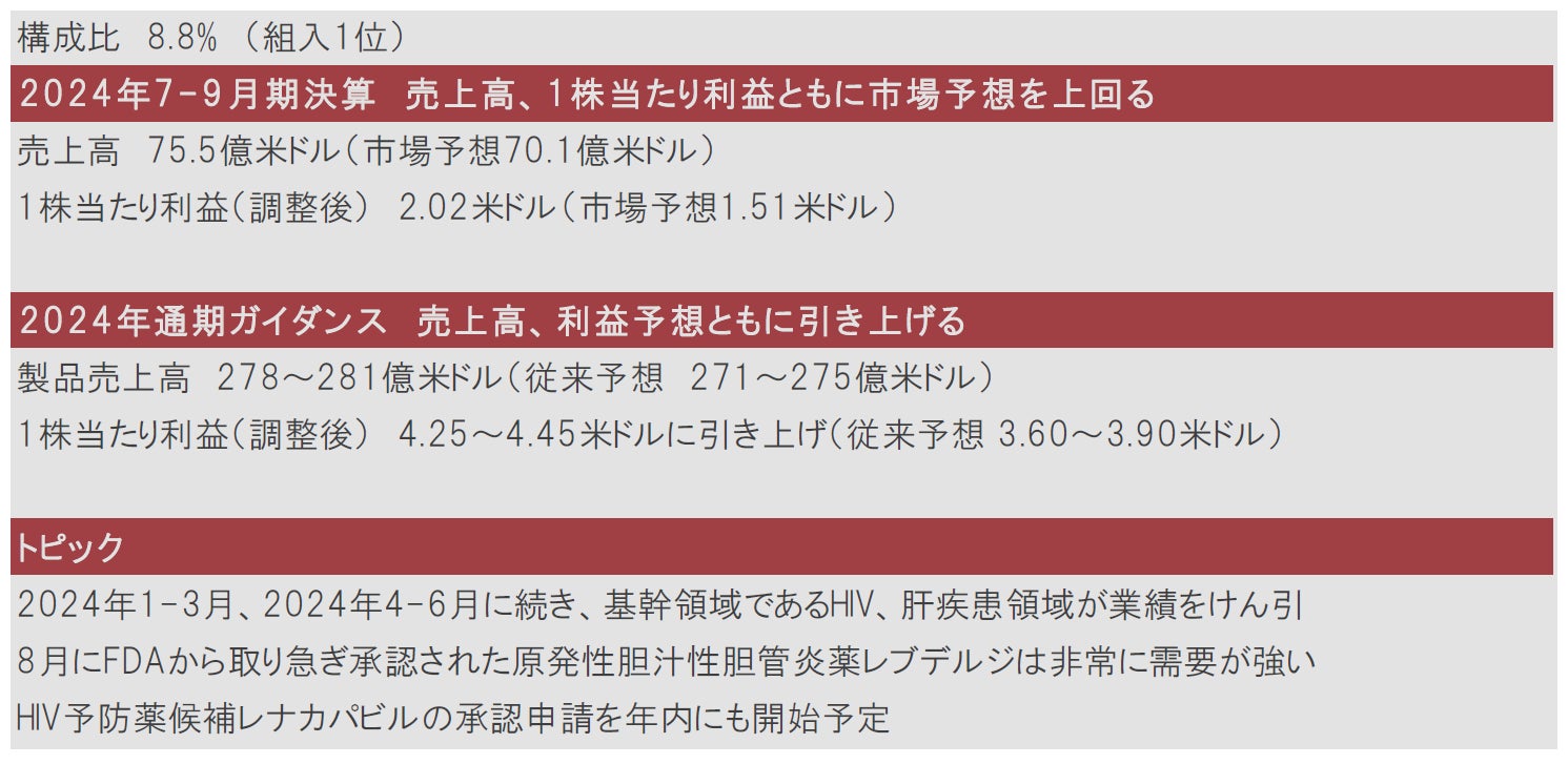 同社の基幹領域であるHIV治療薬のビクタルビの売上高が前年同月比+13%と大きく伸びたことに加え、肝疾患領域の治療薬群などが堅調で業績をけん引しました。