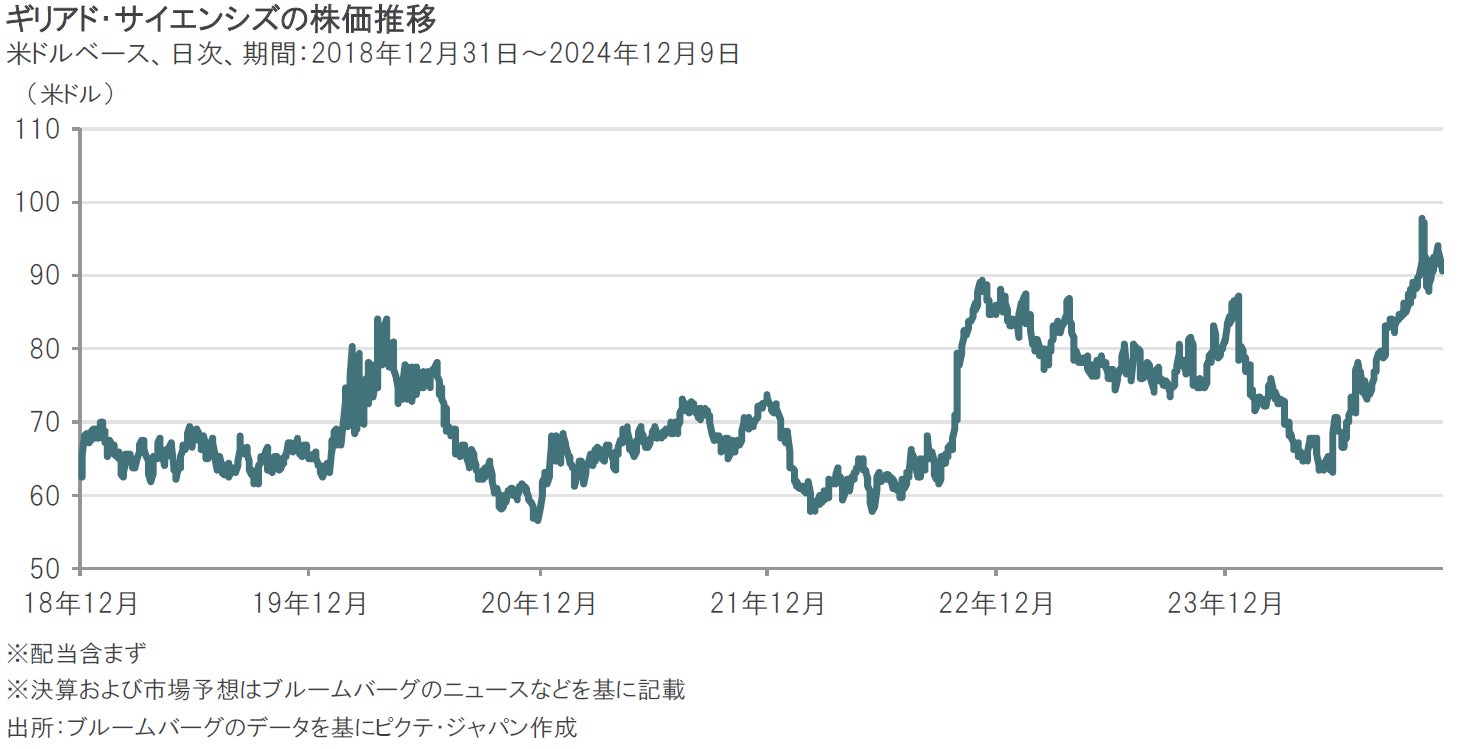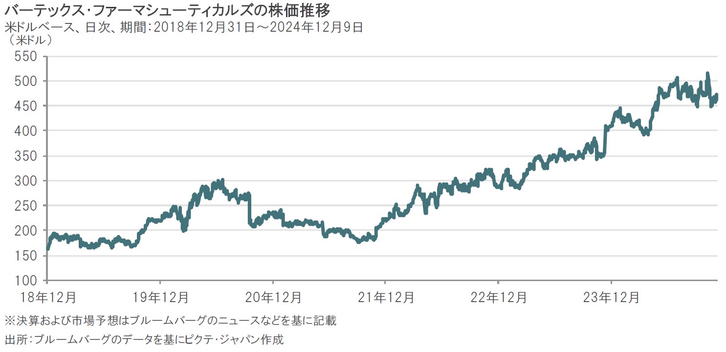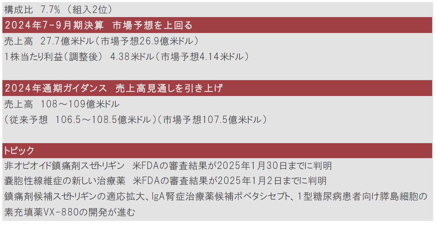 2024年7-9月期の決算は、主力の嚢胞性線維症治療薬トリカフタ/カフトリオが好調で、売上高、1株当たり利益ともに市場予想を上回りました。また通期の売上高見通しについても上方修正しました。