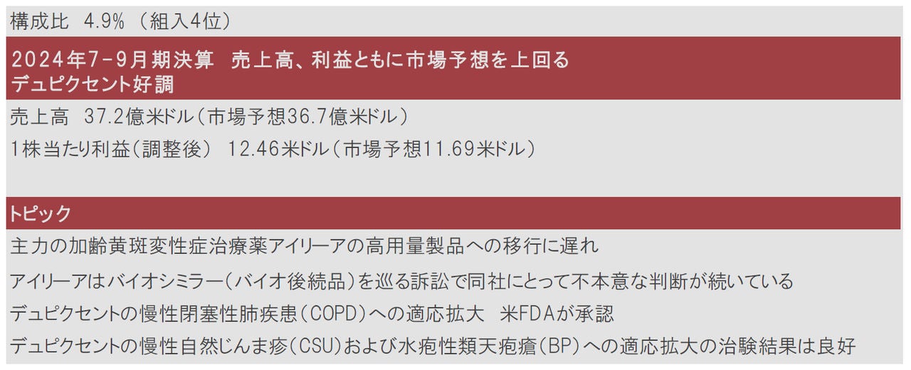 2024年7-9月期の決算は、売上高、1株当たり利益ともに市場予想を上回りました。ぜんそく、アトピー性皮膚炎などの治療薬デュピクセント(サノフィ(仏)との共同開発)と加齢黄斑変性症治療薬アイリーアが業績をけん引しました。
