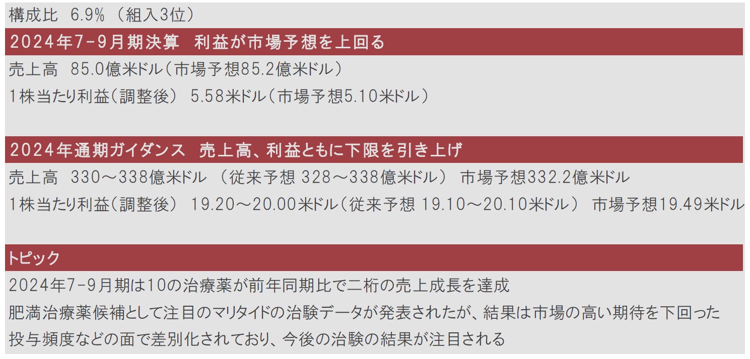 2024年7-9月期の決算は、売上高が小幅に市場予想を下回りましたが、1株当たり利益は市場予想を上回りました。少なくとも10の治療薬が前年同期比で二桁の売上成長を達成するなど、既存薬の販売は好調に推移しています。
