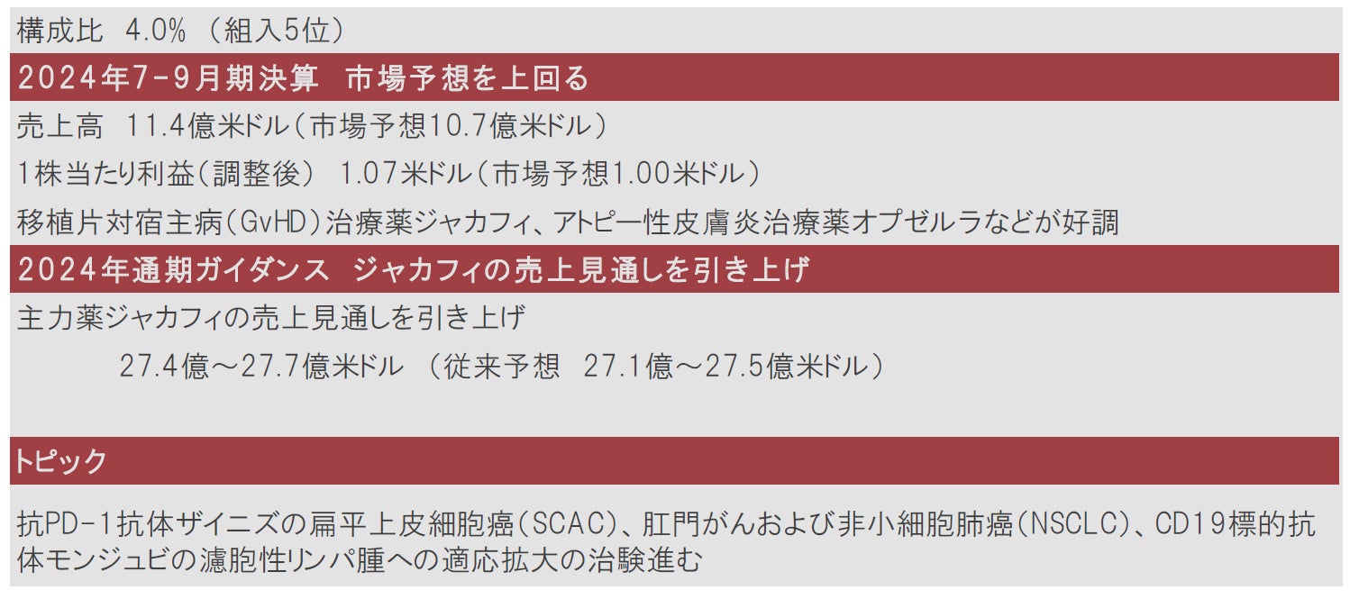 2024年7-9月期の決算は売上高、1株株当たり利益ともに市場予想を上回りました。なお会社全体の通期ガイダンスは発表していませんが、主力治療薬ジャカフィについては、売上見通しを従来の27.1億~27.5億米ドルから27.4億~27.7億米ドルに上方修正しました。