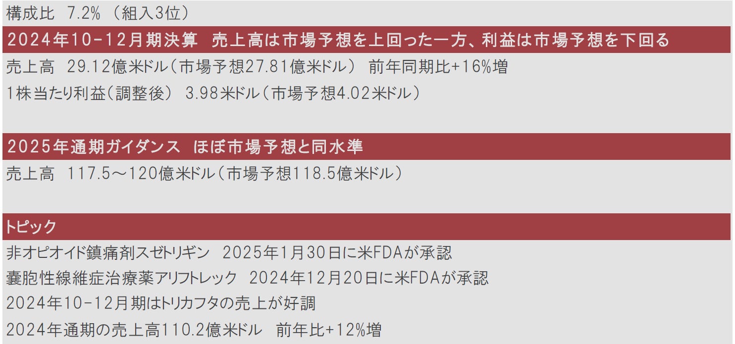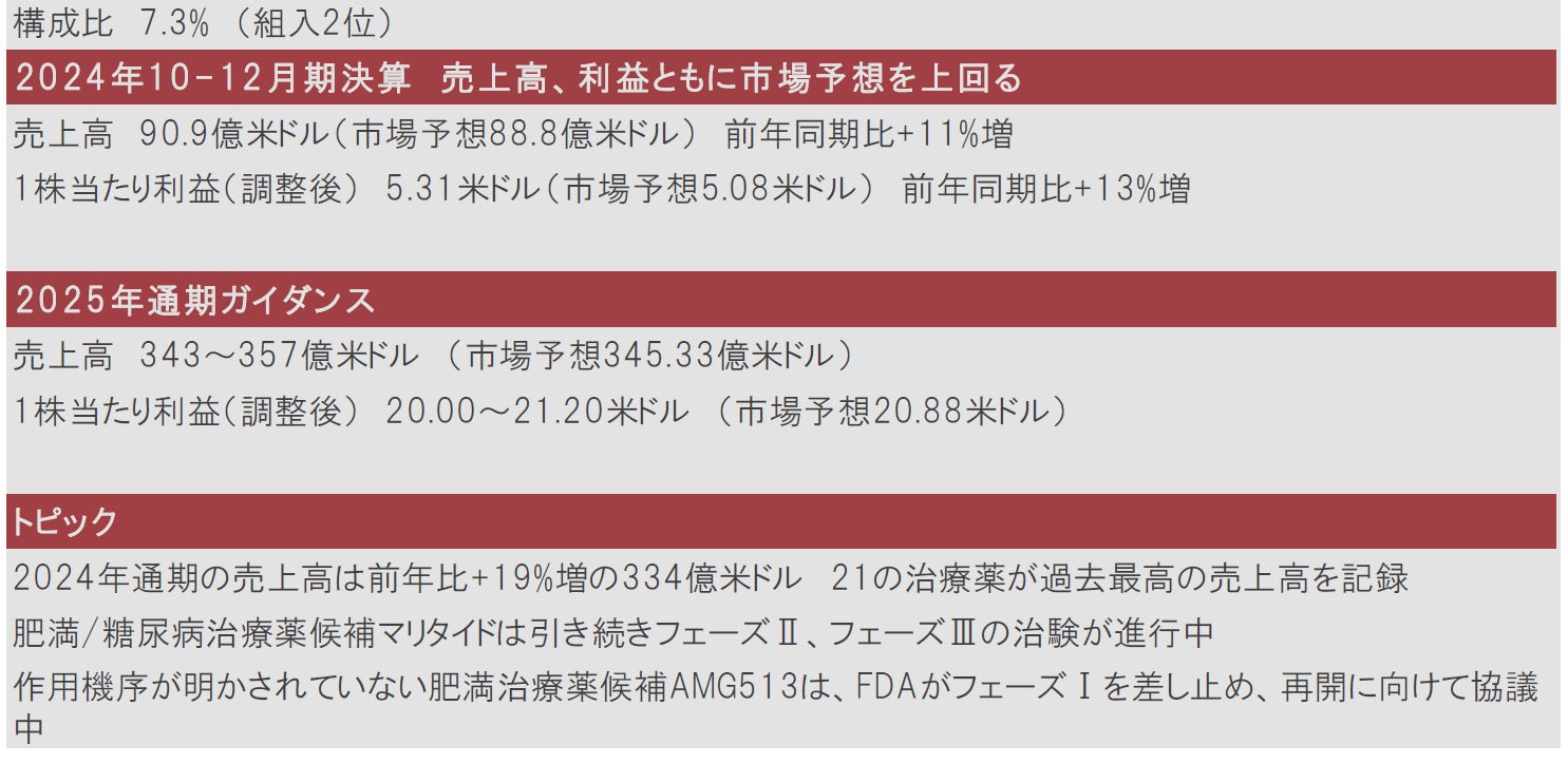 2024年10-12月期の決算は、売上高、1株当たり利益ともに市場予想を上回りました。また2024年通期の売上高についても、21の治療薬が通年で過去最高の売上高を記録したことなどが寄与し、前年比+19%増と大幅増収となりました。2025年の通期ガイダンスについては、売上高はほぼ市場予想通りの水準となっています。