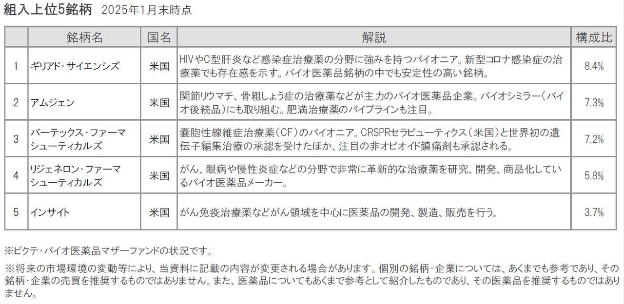 当ファンドの組入上位の銘柄では、ギリアド・サイエンシズ(米国)、アムジェン(米国)、リジェネロン・ファーマシューティカルズ(米国)が主力治療薬の販売が好調だったことから売上高、利益ともに市場予想を上回る決算となりました。一方、バーテックス・ファーマシューティカルズ(米国)とインサイト(米国)は、売上高は市場予想を上回ったものの、利益が市場予想を下回りました。