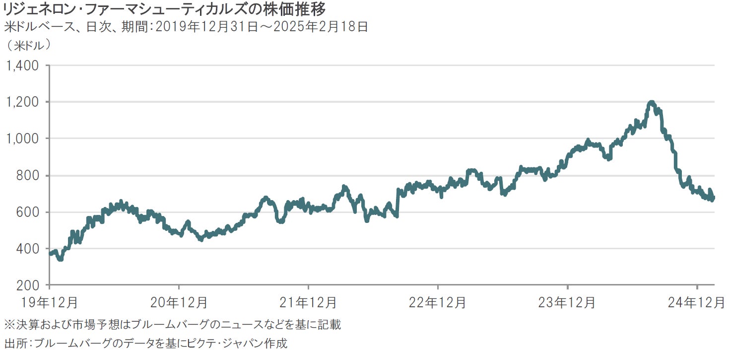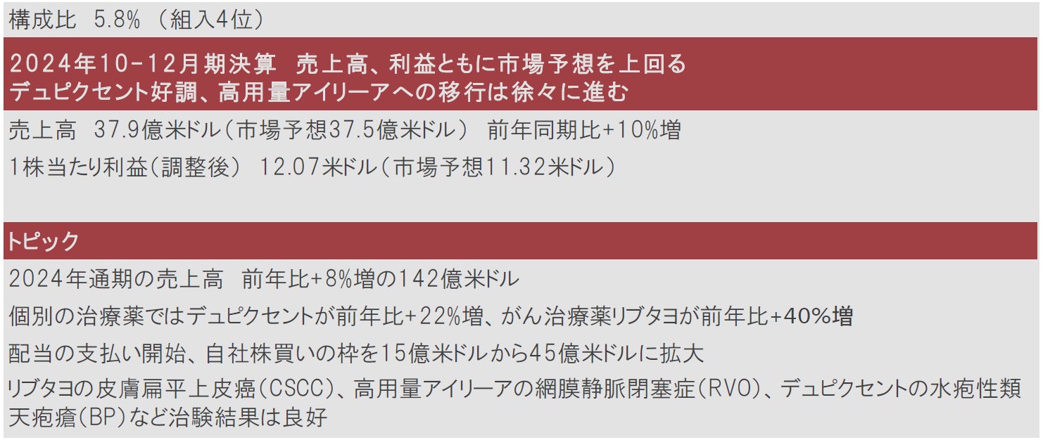 2024年10-12月期の決算は、売上高、1株当たり利益ともに市場予想を上回りました。また2024年通期の売上高も前年比+8%増となりました。ぜんそく、アトピー性皮膚炎などの治療薬デュピクセント(サノフィ(仏)との共同開発)が業績をけん引した他、加齢黄斑変性治療薬アイリーアは、高用量製品への移行が徐々に進んでいます。