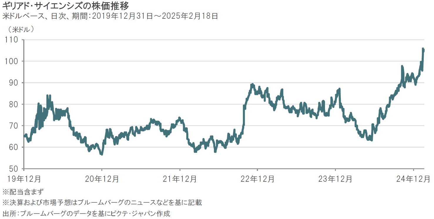 2024年10-12月期の決算は、売上高、1株当たり利益ともに市場予想を上回りました。同社の基幹領域であるHIV治療薬のビクタルビの売上高が前年同期比+21%と大きく伸びたことに加え、肝疾患領域やがん領域の治療薬群などが堅調で業績をけん引しました。