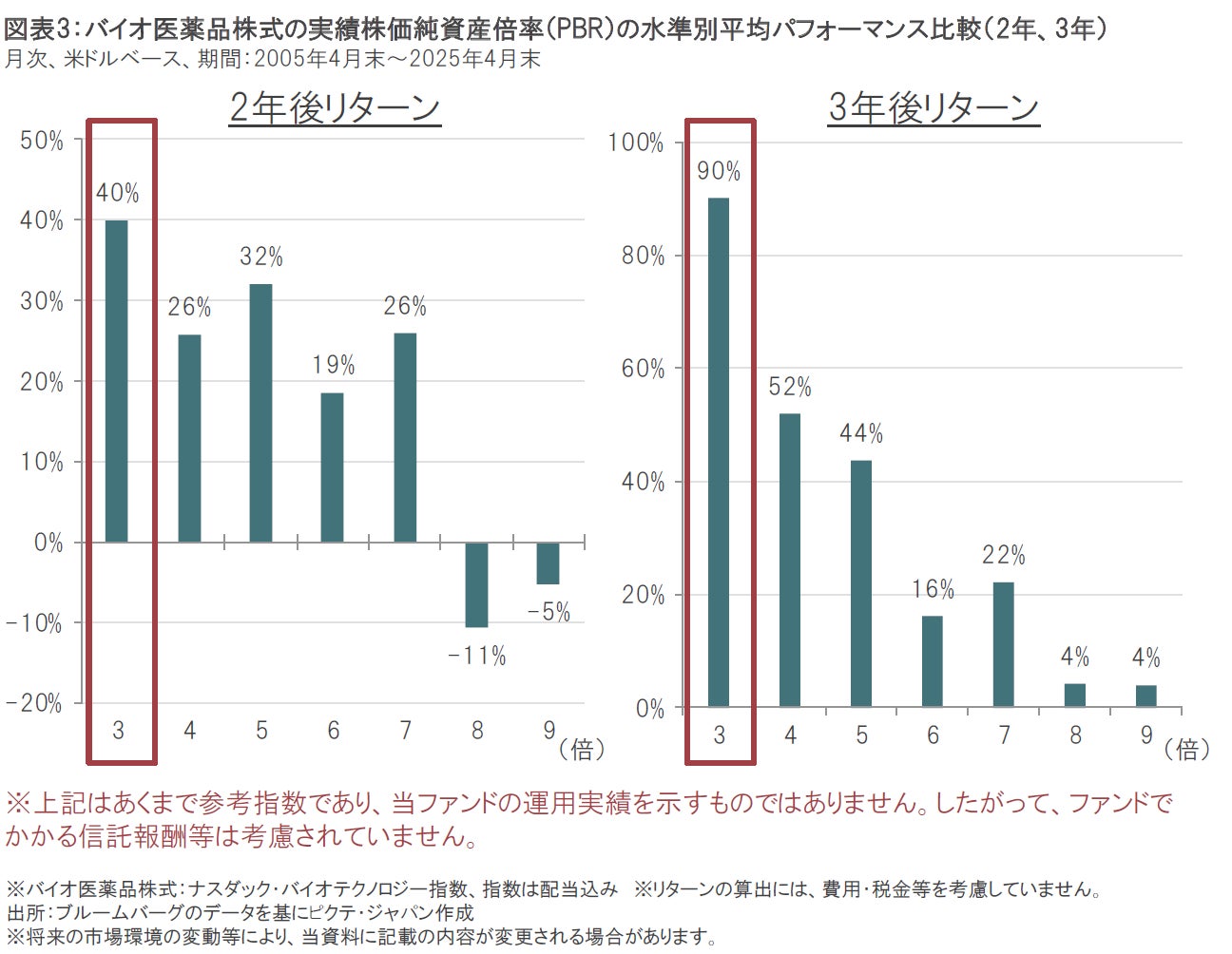 2025年5月14日時点でバイオ医薬品株式の実績PBRは3.5倍となっています。図表3をみると、実績PBRが3倍となった後、2年後には平均で40%上昇、3年後には平均で90%上昇したことが分かります。