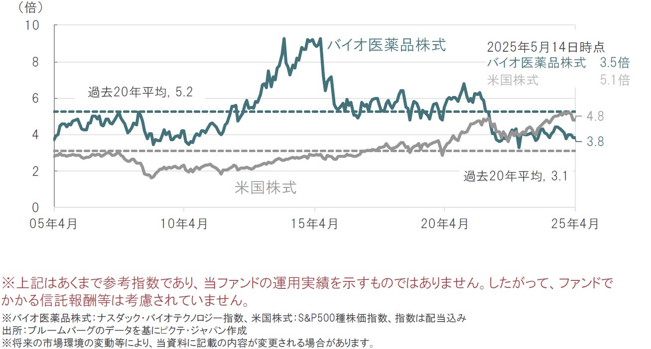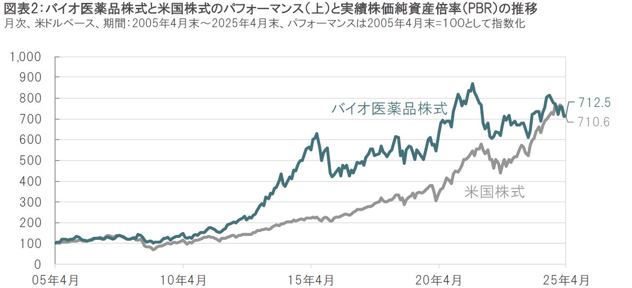 バイオ医薬品株式は、開発途中の新薬候補(パイプライン)開発に注力し、まだ承認された治療薬を有しておらず、赤字の企業が多く存在しています。そのため資産ベースのバリュエーションを実績株価純資産倍率(PBR)でみると、2025年5月14日時点でバイオ医薬品株式は3.5倍と、過去20年の平均5.2倍を大きく下回る水準となっています(図表2参照)。また、同日の米国株式の実績PBRは5.1倍で、相対的にみてもバイオ医薬品株式の実績PBRの水準は割安となっていることがわかります。