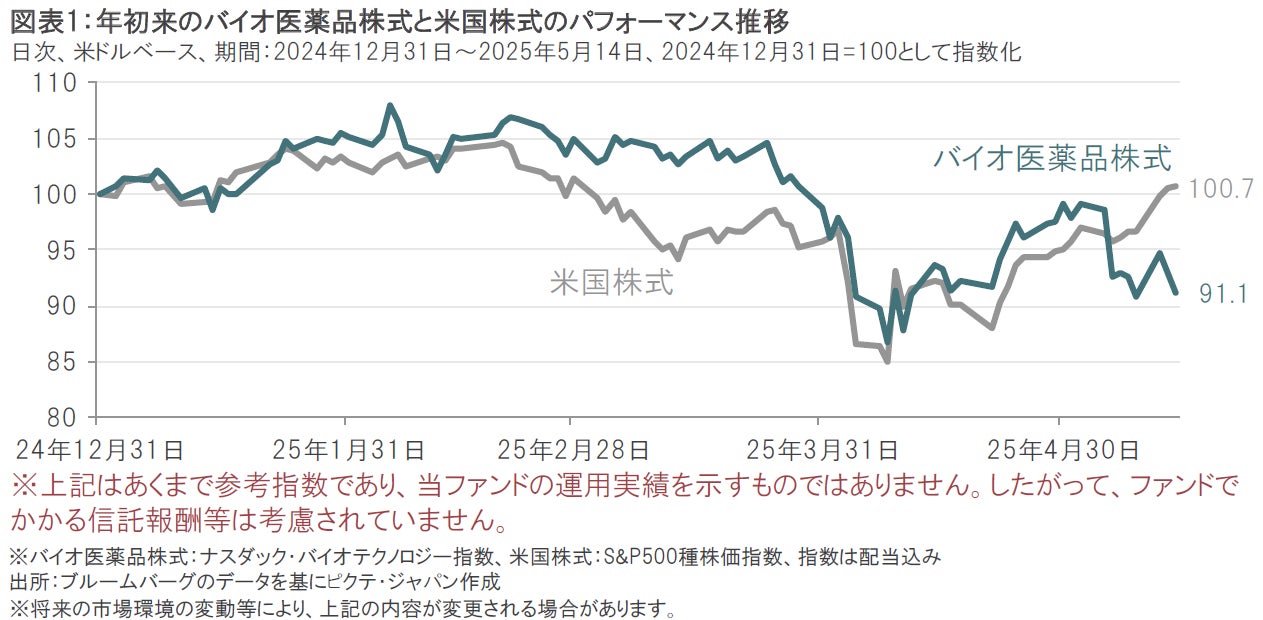 バイオ医薬品株式は、3月下旬まで米国株式に比べ相対的に堅調に推移していました。しかし、それ以降は、米国のトランプ政権による関税引き上げの発表で株式市場の変動が大きくなる中、3月27日に米食品医薬品局(FDA)での大幅な人員削減が発表されたのを皮切りに、3月28日にはFDAの生物製剤評価研究センター(CBER)の所長ピーター・マークス氏が辞任することを発表、その後も、5月6日に新型コロナウイルスワクチンに批判的な姿勢を示していたビナイ・プラサド氏のCBER所長指名、5月12日に米トランプ大統領による薬価引き下げに関する大統領令への署名などヘルスケア業界にとってネガティブとも捉えられる発表が相次ぎました。そのため、年初来の水準まで株価が回復している米国株式に比べ、バイオ医薬品株式は軟調な動きとなっています(図表1参照)。