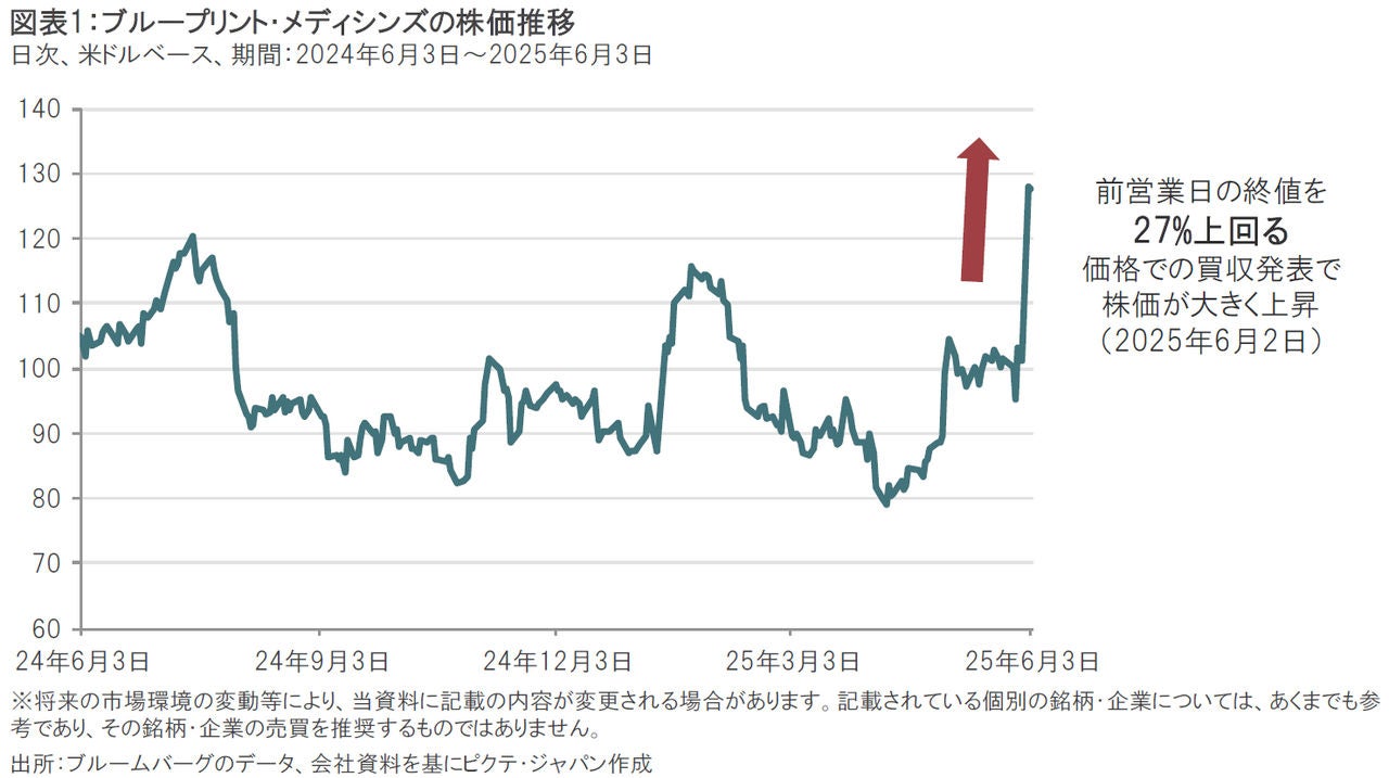 2025年6月2日、仏大手医薬品企業サノフィが、米国のバイオ医薬品企業ブループリント・メディシンズを1株あたり129米ドル、総額約91億米ドルで買収することを発表しました。なお買収金額の1株あたり129米ドルは、前営業日(2025年5月30日)の株価101.35米ドルを27%上回る水準となっています。