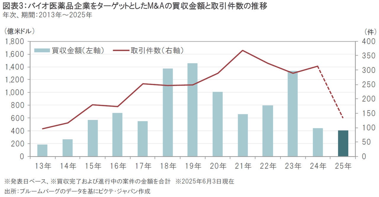 大手医薬品企業によるバイオ医薬品企業をターゲットとしたM&Aは、2024年は米国大統領選挙を控えていたこともあり、ここ数年の中では低調な水準となりました。2025年についても、トランプ政権のヘルスケア関連の政策などが不透明要因となっていますが、M&Aは回復傾向にあり、買収金額の合計は6月3日時点で2024年の1年間の額に近づいています(図表3参照)。
