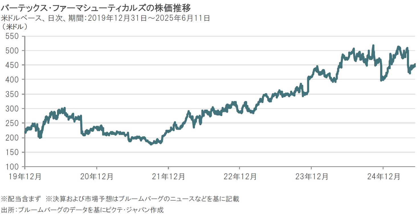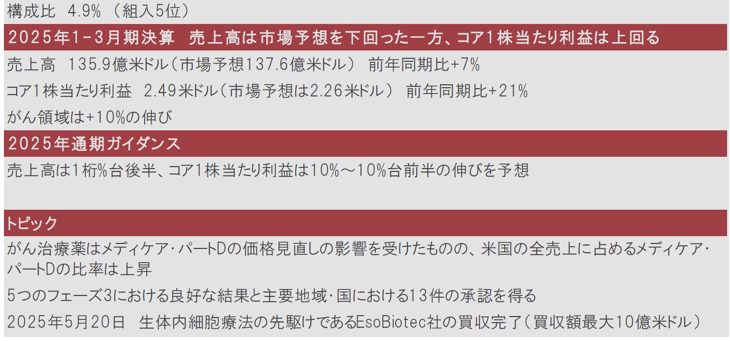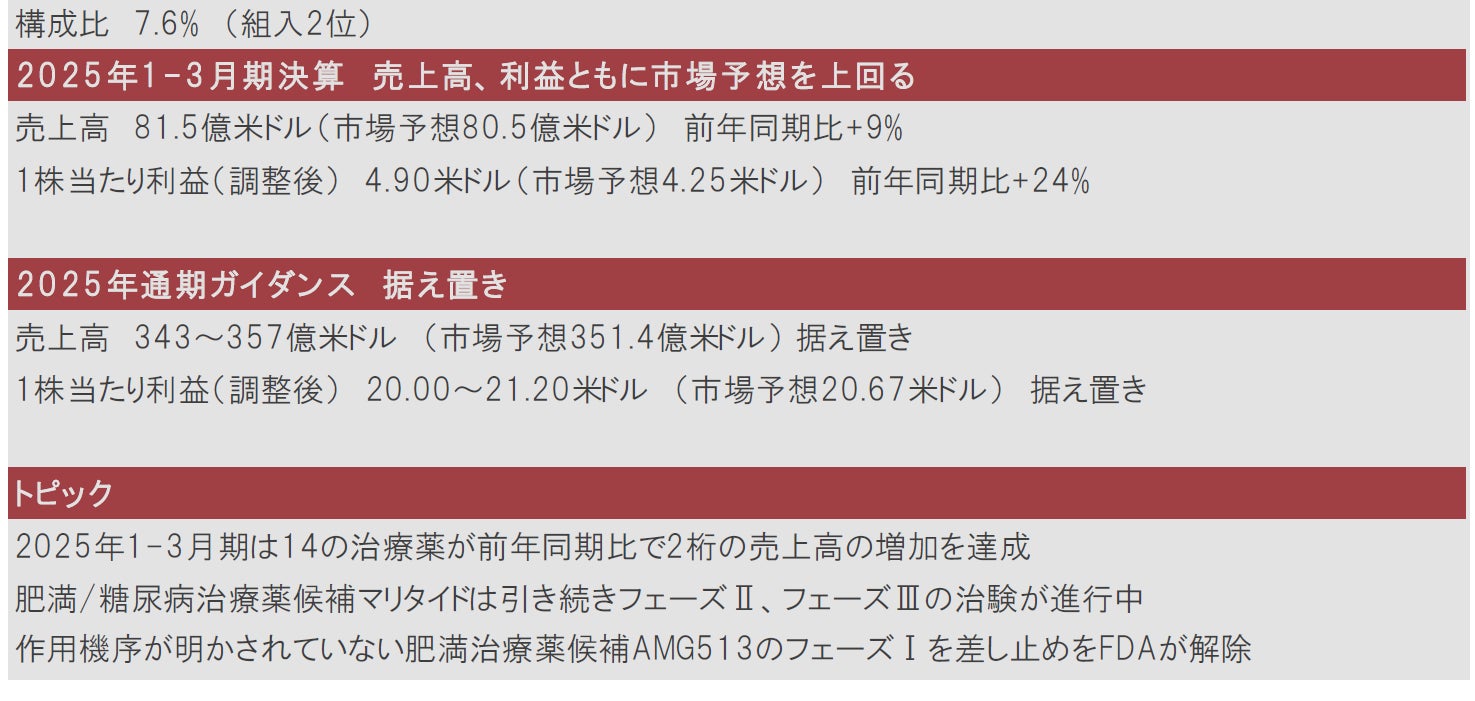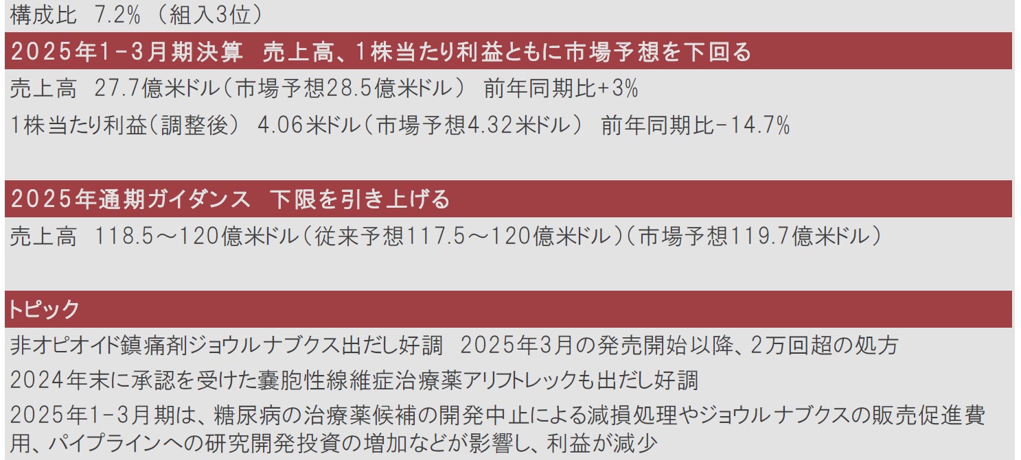 2025年1-3月期の決算は、売上高、1株当たり利益ともに市場予想を上回りました。14の治療薬が前年同期比で2桁の売上高の増加を達成したことなどが業績をけん引し、売上高は前年同期比+9%、1株当たり利益(調整後)は+24%となりました。なお、2025年の通期ガイダンスについては、売上高、1株当たり利益(調整後)ともに据え置かれました。