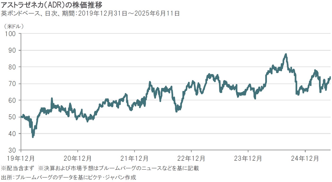 2025年1-3月期の決算は、売上高が市場予想を下回ったものの、前年同期比では+7%の増収となりました。「タグリッソ」や「イミフィンジ」など主力のがん治療薬は、前年同期比+10%の伸びとなりましたが、市場予想は下回りました。一方、コア1株当たり利益は市場予想を上回りました。なお2025年通期のガイダンスでは、売上高は1桁%台後半、コア1株当たり利益は10%~10%台前半の伸びを予想しています。