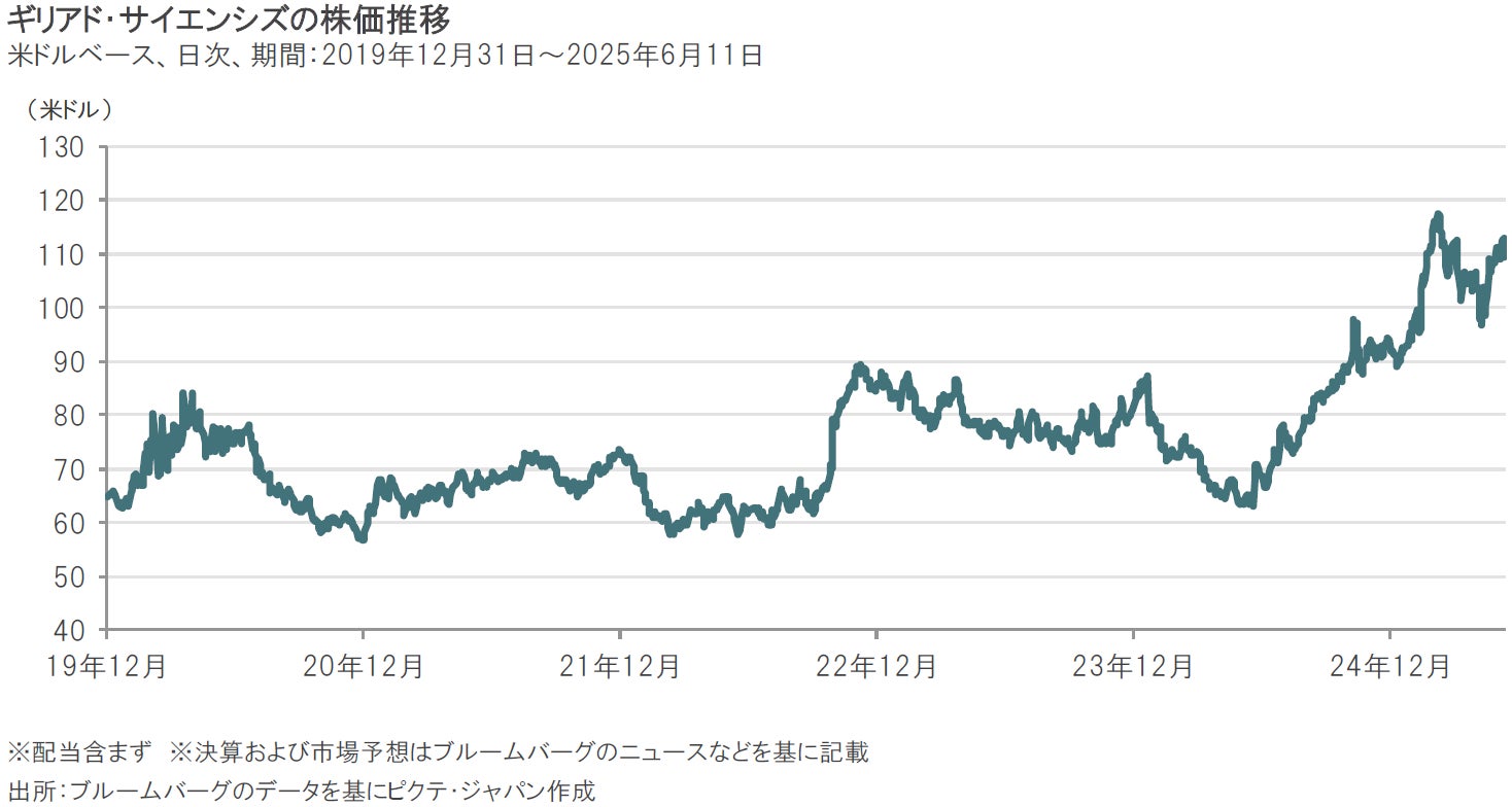 2025年1-3月期の決算は、売上高が市場予想を下回り、前年同期比では-0.3%の減収となりました。同社の基幹領域であるHIV治療薬(ビクタルビなど)の売上高が前年同期比+6%となったことに加え、肝疾患領域も堅調でしたが、抗ウイルス剤ベクルリーやがん領域が低調となったことが影響しました。一方、1株当たり利益(調整後)は、市場予想を上回り、黒字化しました。