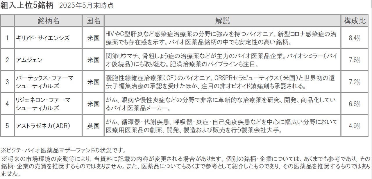 当ファンドの組入上位の銘柄では、アムジェン(米国)が売上高、利益ともに市場予想を上回る決算となりました。一方、バーテックス・ファーマシューティカルズ(米国)、リジェネロン・ファーマシューティカルズ(米国)は売上高、利益ともに市場予想を下回る結果となりました。ギリアド・サイエンシズ(米国)、アストラゼネカ(英国)については、売上高が市場予想を下回った一方、利益は市場予想を上回りました。
