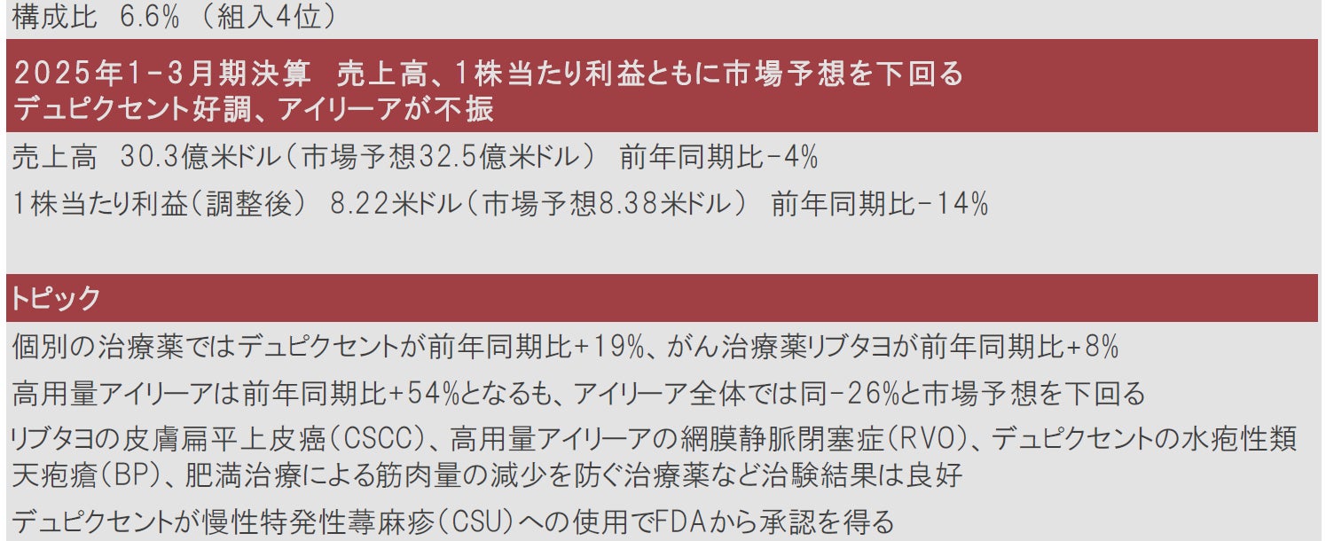 2025年1-3月期の決算は、売上高、1株当たり利益(調整後)がともに市場予想を下回りました。ぜんそく、アトピー性皮膚炎などの治療薬デュピクセント(サノフィ(仏)との共同開発)は好調でしたが、加齢黄斑変性治療薬アイリーアは、高用量製品への移行が進んではいるものの、アイリーア全体(従来品+高用量)の売上が前年同期比で-26%と大きく減少したことが影響しました。