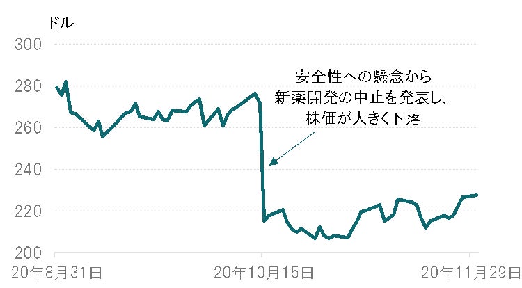 一方、新薬の開発動向についてネガティブなニュースが出た場合には株価は大きく下落することになります。2020年10月に米国の大手バイオ医薬品企業バーテックス・ファーマシューティカルズ(米国)が、安全性への懸念から治験を実施していた新薬候補の開発中止を発表した際には株価は1日で20%超下落しました(図表3参照)。