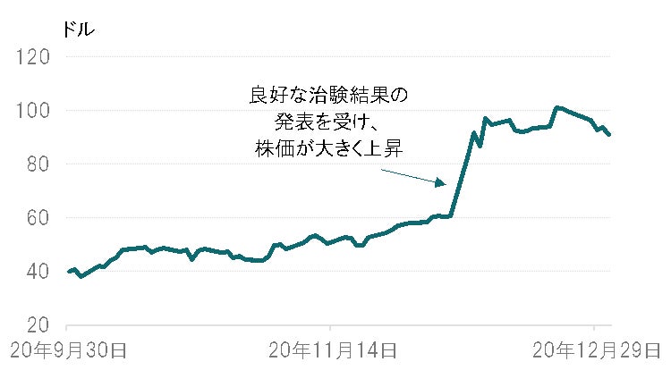 下のグラフは米国のバイオ医薬品企業フェイト・セラピューティクスの株価推移ですが、2020年12月7日に開発中の新薬について良好な治験結果を発表したことを受けて同社の株価は大きく上昇しました(図表2参照)。