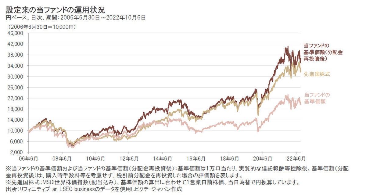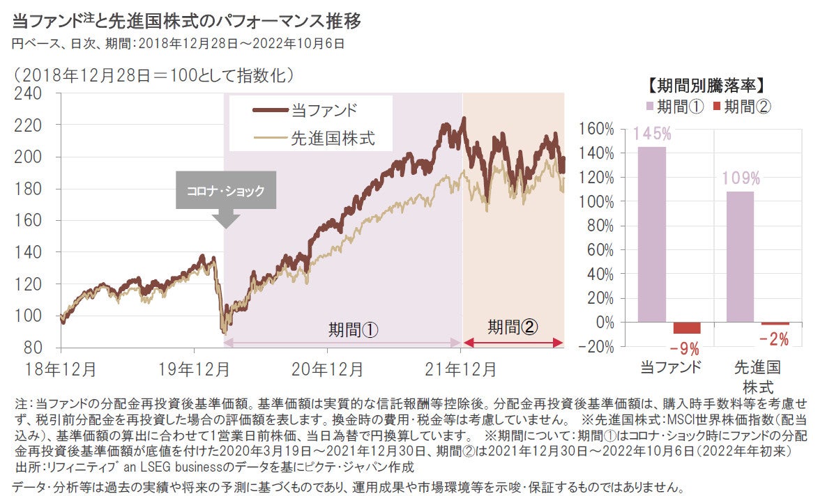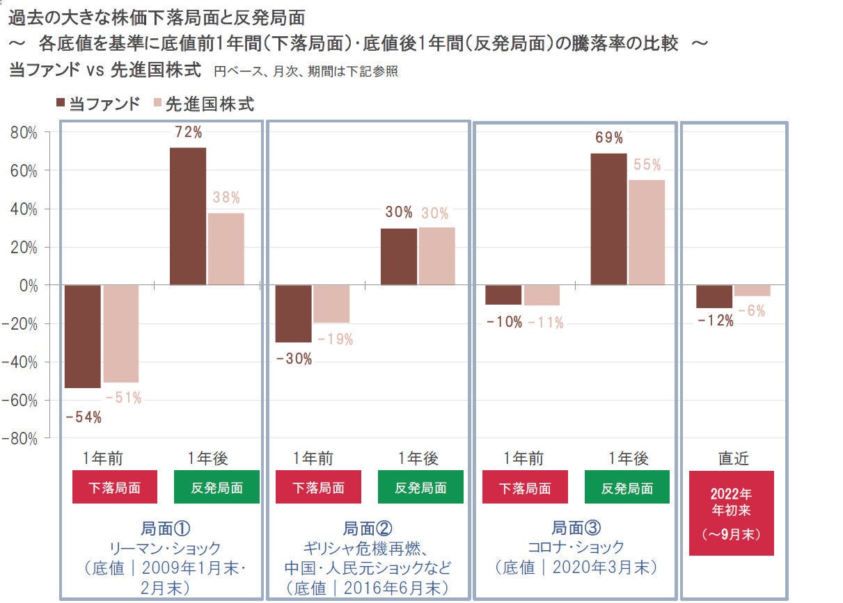 過去の実績では、株式市場の反発局面において、当ファンドの分配金再投資後の基準価額は投資先であるプレミアム・ブランド企業の株価が大きく上昇したことを受けて、力強く上昇してきました。リーマン・ショック後やコロナ・ショック後には先進国株式を上回る上昇率となりました。