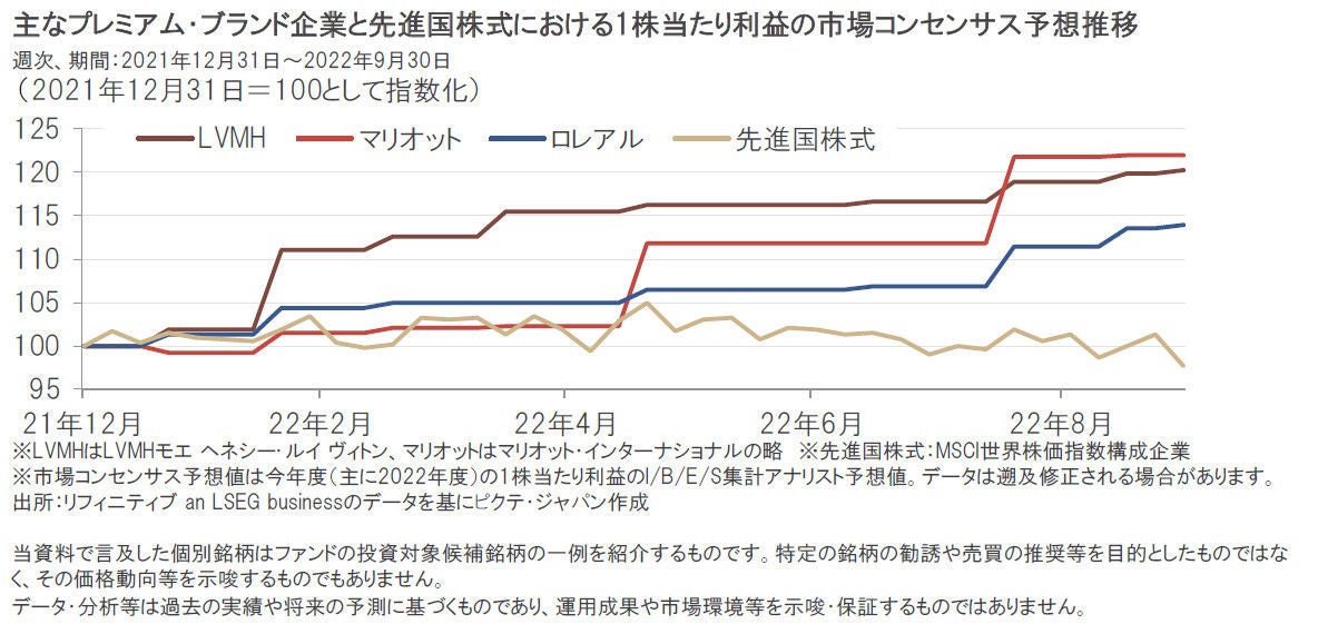 1株当たり利益の市場コンセンサス予想の推移をみても、主なプレミアム・ブランド企業については、良好な四半期決算の発表を受けて上方修正傾向が続いており、市場では利益成長が継続すると期待されています。