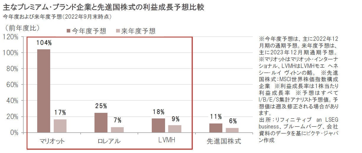 一方、プレミアム・ブランド企業の業績動向は概ね良好であり、相対的に高い利益成長が予想されています。引き続き、コロナ・ショック後のリベンジ消費が旺盛であることに加えて、各国の水際対策の緩和などから回復の遅れていた旅行関連需要の回復も見込まれています。