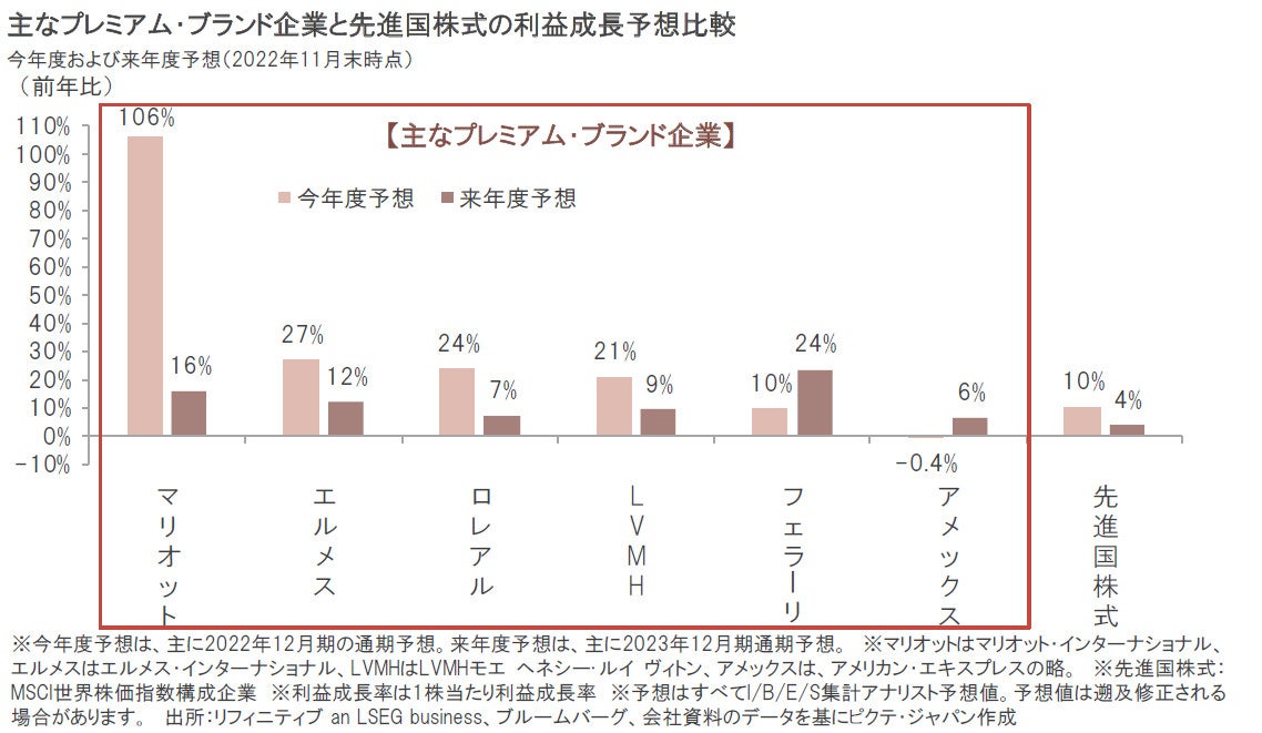 プレミアム・ブランド企業の業績動向は概ね良好です。来年度(主に2023年12月期)についても引き続き相対的に高い利益成長が予想されている企業が多くあります。足元では、欧米を中心に景気減速・後退懸念も高まっていますが、プレミアム・ブランド商品については根強い需要があることや、各国の水際対策の緩和などから回復が遅れていた旅行関連需要も、本格的な回復に向かうと期待され、特にホテル運営企業などは恩恵を受けると予想されています。