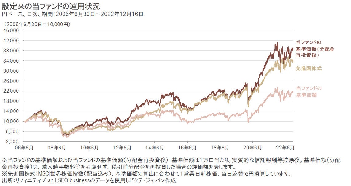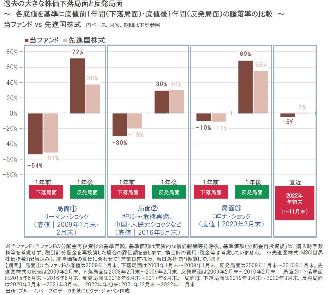 過去の実績では、株式市場の反発局面において、当ファンドの分配金再投資後の基準価額は投資先であるプレミアム・ブランド企業の株価が大きく上昇したことを受けて、力強く上昇してきました。リーマン・ショック後やコロナ・ショック後には先進国株式を上回る上昇率となりました。
