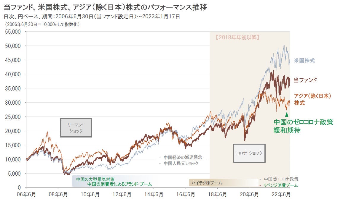 2022年10月後半以降、中国のゼロコロナ政策の緩和観測から、中国の経済再開に対する期待が高まりました(その後2023年1月8日、中国政府はゼロコロナ政策を終了)。こうした期待から、中国株式を中心としたアジア(除く日本)株式の株価は、2022年10月末から足元(2023年1月17日)までの期間でみると、相対的に大きく上昇しました。