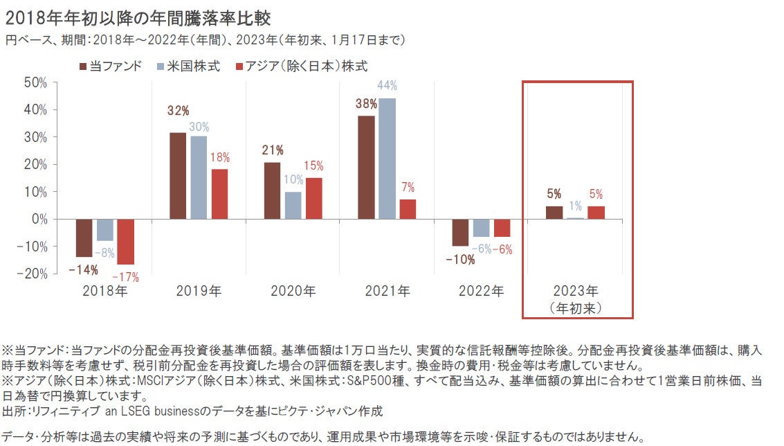 2023年年初来、1月17日までの当ファンドのパフォーマンスは、約+5%の上昇と、アジア(除く日本)株式と同程度の上昇率となりました。