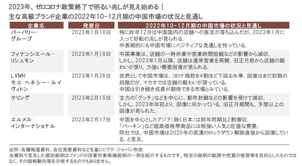 中国の消費者のリベンジ消費で恩恵を享受できると期待される分野の1つは、プレミアム・ブランド企業の代表格である高級ブランド企業です。主要高級ブランド企業の多くは、2022年10-12月期の中国市場について、新型コロナウイルスの感染再拡大の影響などから大きく落ち込んだことを示しました。しかし、2023年年明け以降は、回復の兆しが見え始めているとの見解も示しています。
