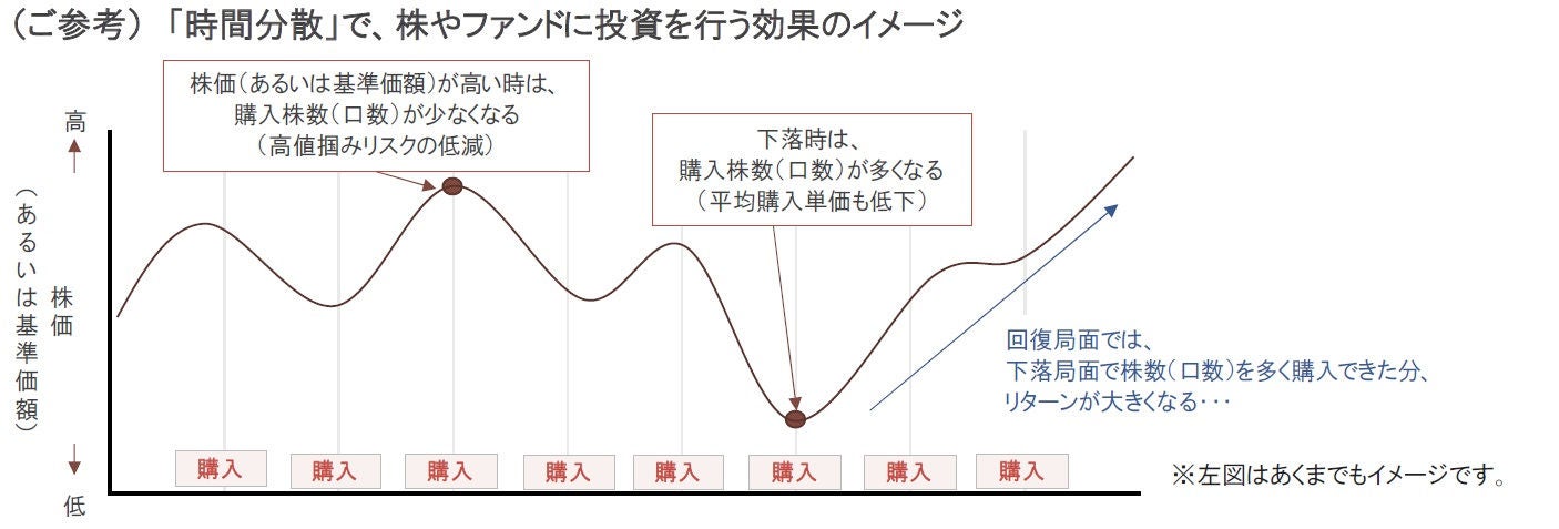 中長期的に成長が期待できる一方、短期的な株価の値動きが大きいプレミアム・ブランド企業の株式への投資では、「時間分散」の考え方が有効な手段の1つであると考えます。一度にすべての資金を投資するのではなく、複数回に分けて投資を行うことで、株価(ファンドの場合は基準価額)が高値にある時は、購入株数(口数)が少なくなるので、高値掴みのリスクが低減されます。一方、下落局面でも一定金額の投資を継続すれば、株数(口数)を多く購入でき、平均購入単価を引き下げることができます。この効果は、その後の上昇局面でより大きなリターンの享受につながります。また、急落時には一括して大きな金額を投資した場合より、損失額を抑えることもできます。
