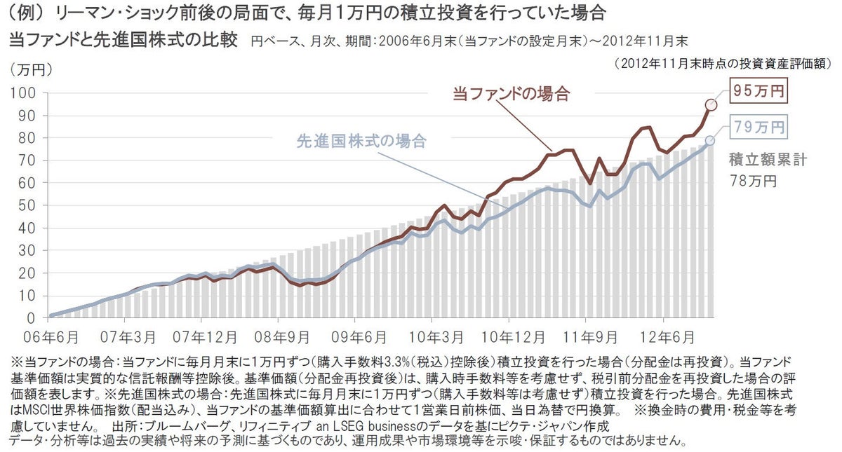 「時間分散」の考え方でもある積立投資を例に、当ファンドの設定来(2006年6月末)から、リーマン・ショックを経て、2012年11月末まで毎月1万円ずつ積立投資を実施していたと仮定し、当ファンドと先進国株式の場合を比較してみていきます。