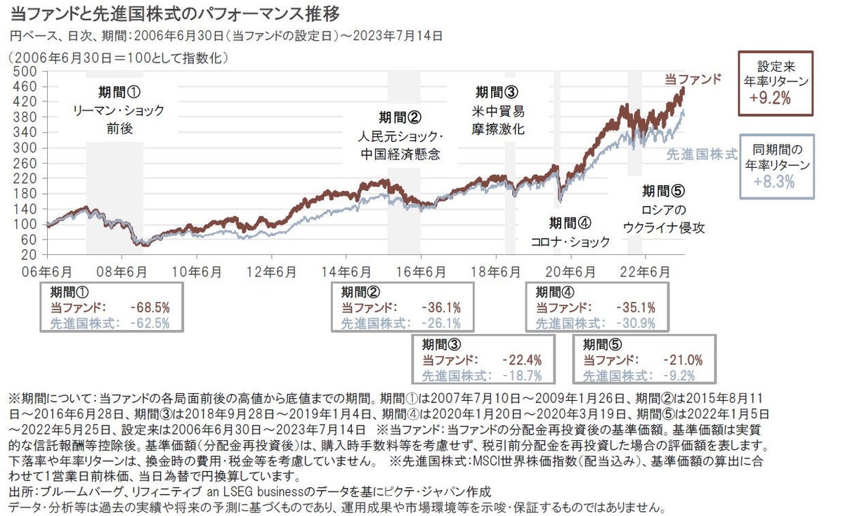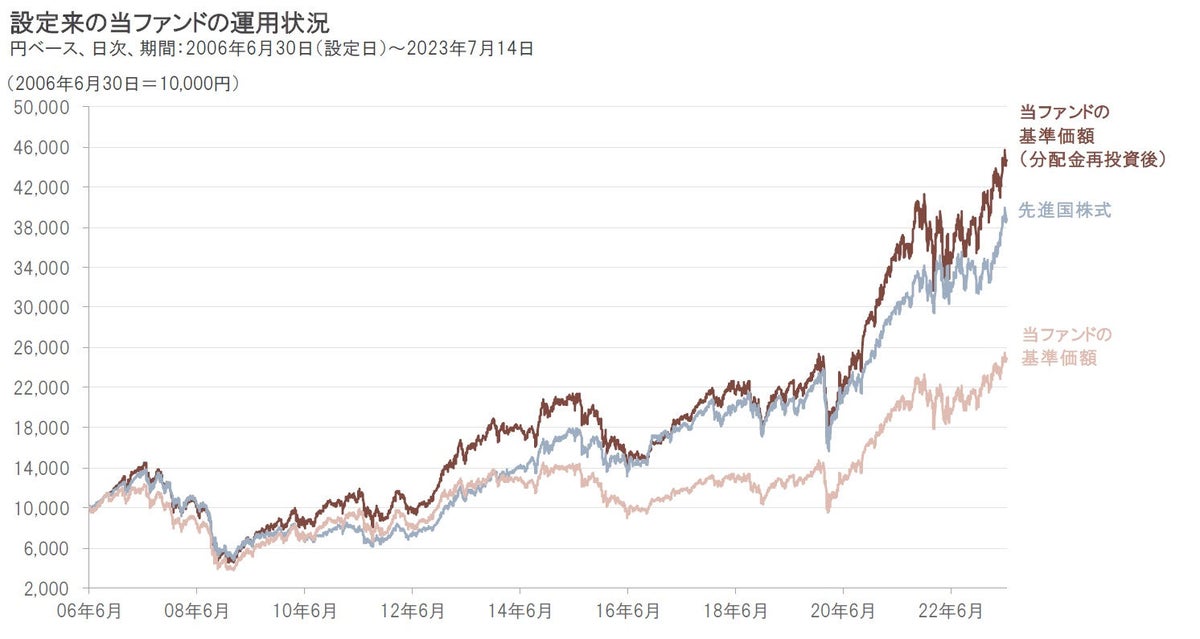 当ファンドは、主に世界のプレミアム・ブランド企業の株式に投資を行っています。2006年6月30日のファンド設定以来、足元(2023年7月14日)までのパフォーマンス(分配金再投資後基準価額)は、+347%、年率では+9.2%の上昇と、先進国株式注1(+288%、年率では+8.3%)を上回りました注2。